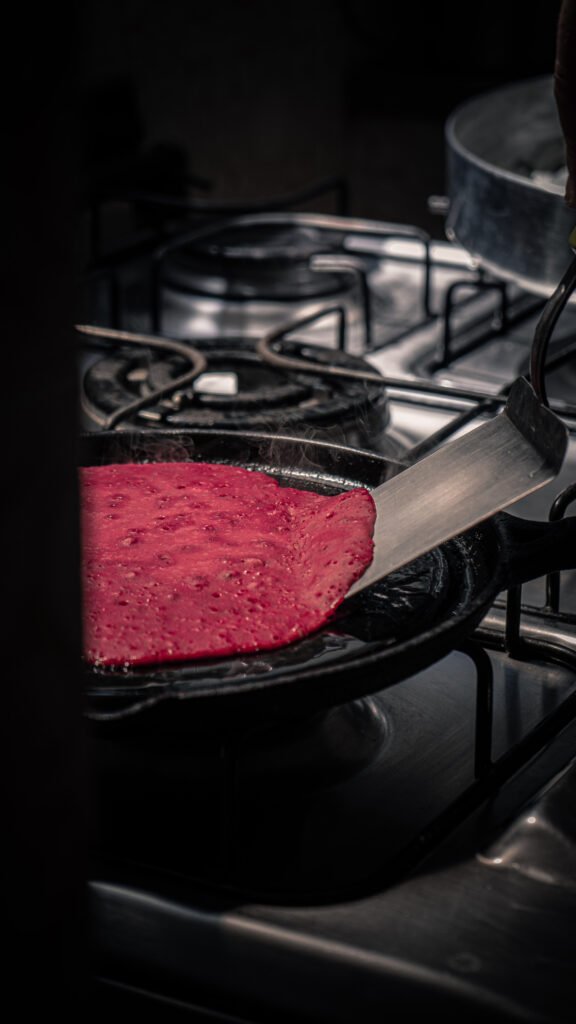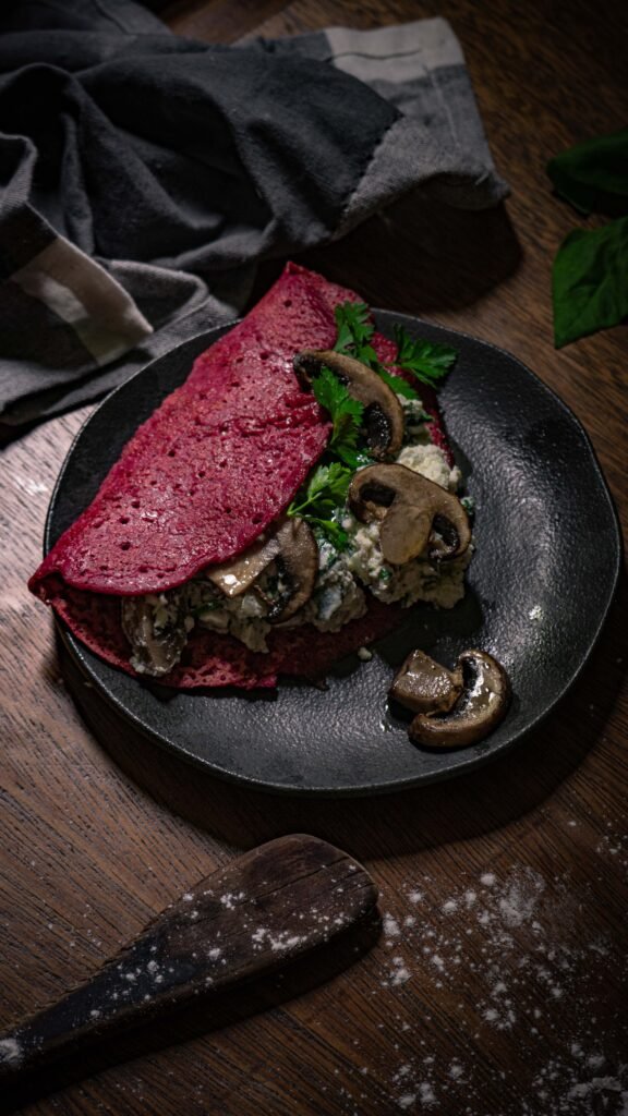 A panqueca é vibrante, colorida e totalmente plant-based. A fotografia destaca a intensidade da beterraba e a textura suculenta dos cogumelos, criando uma composição que une saúde e criatividade culinária. É uma imagem que representa a diversidade da gastronomia vegetal ao usar contrastes de cores, luzes e sombras.