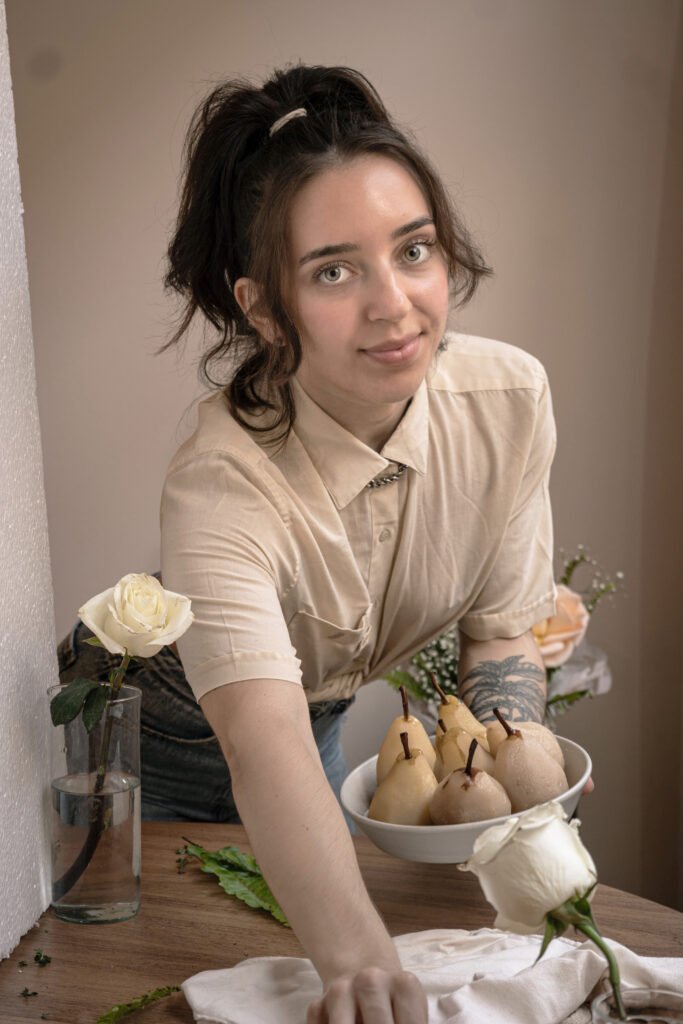A estética minimalista da fotografia realça a sofisticação do doce de pera ao vinho branco com creme de iogurte e tomilho.